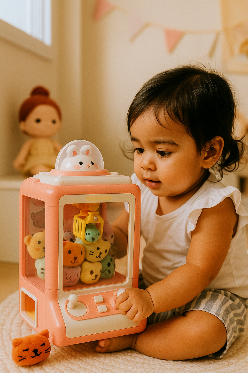 Com a Máquina de Diversão Pega Ursinhos, as crianças podem viver a experiência da grua clássica dos parques diretamente no quarto ou na sala.