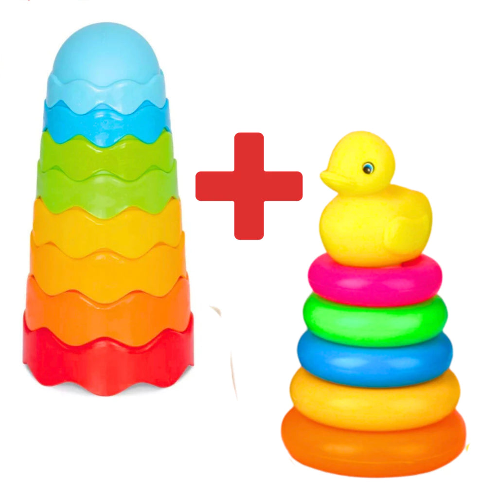 Este kit educativo 2 em 1 reúne dois brinquedos encantadores: uma torre mágica colorida com argolas para empilhar e um divertido animal de encaixe (papagaio ou pato). Juntos, eles ajudam no desenvolvimento das habilidades motoras, no reconhecimento de formas e cores, além de promover a coordenação olho-mão.